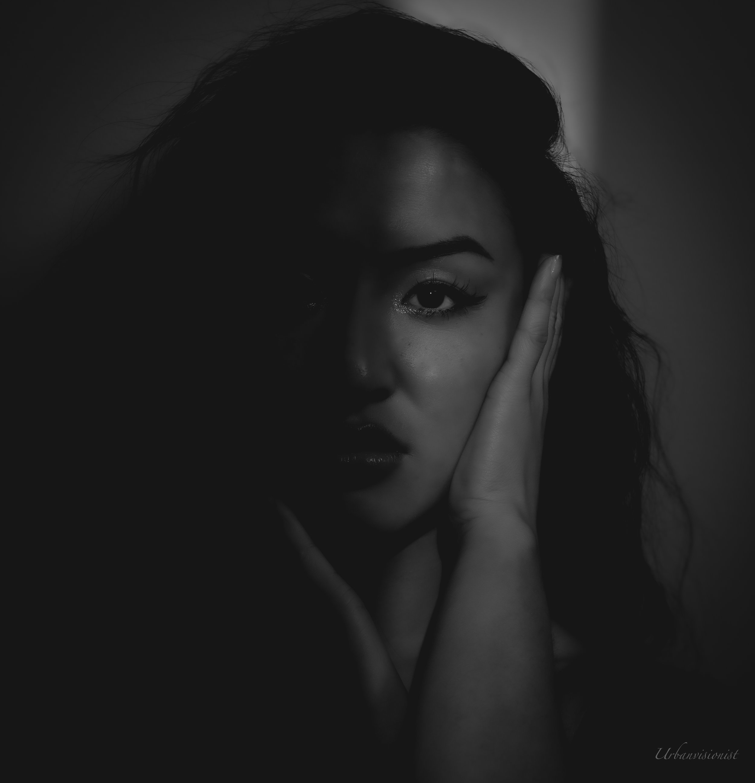 A black-and-white portrait photograph of a woman, emphasizing her arm and face partially obscured, set against a dark background and placed on a wooden surface with a wooden chair behind it.
